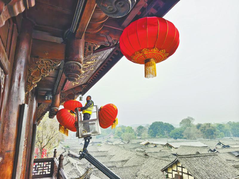 1月18日,南充阆中古城中天楼,工人安装大红灯笼。 梁德 摄(C视觉)