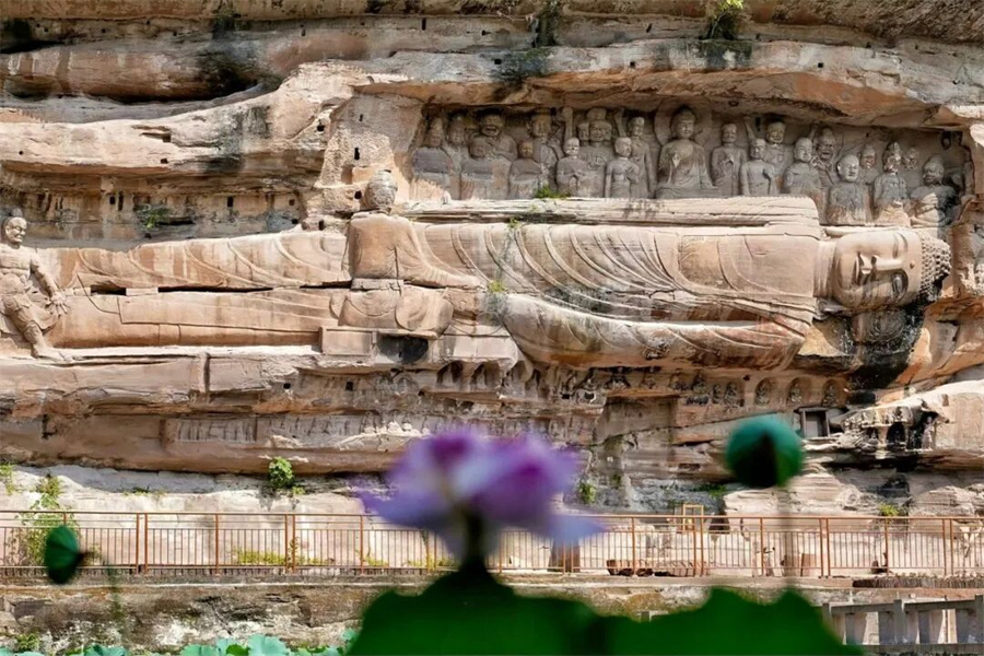 让参观者发出惊叹的还有位于县城北边的卧佛院。步入寂静院落,穿过小道,一尊长达23米的左侧卧佛映入眼前。这尊造像不仅体量庞大,其造型线条圆润流畅,神态安详宁静,细节处处彰显盛唐的豪迈之气。不仅如此,长约一公里的崖壁上,存有大批刻凿于唐代、五代、宋代的摩崖石刻造像和石刻佛经,现存可辨清文字30余万字。另有碑刻、题记、经幢等遗迹数十处,造像题材多达57种。
