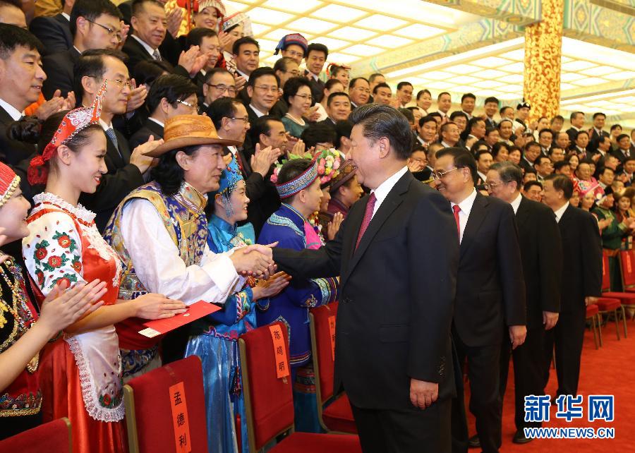 8月18日晚,第五届全国少数民族文艺会演开幕式文艺晚会在北京人民大会堂隆重举行,习近平、李克强、俞正声、刘云山等党和国家领导人出席观看。演出开始前,习近平等会见了各民族演职人员代表。新华社记者姚大伟摄