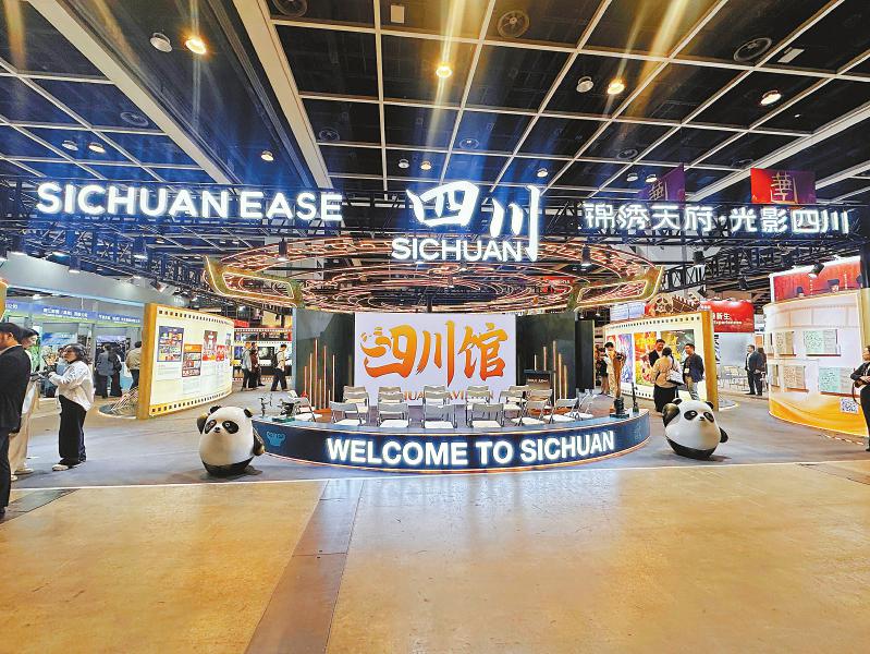 随着红色帷幕拉开,“四川馆”牌匾亮出,展区内大屏同步点亮,标志着四川影视力量再次亮相这一亚洲重要影视交易平台。四川馆规划金熊猫奖、作品展示、科技体验等七大板块。作品展示区精选《哪吒之魔童闹海》等20余部“四川造”影视作品;科技体验区引入《三星堆 通天神树》XR数字空间,现场不少嘉宾戴上头显设备,沉浸式感受古蜀文明,体验科技与文化的融合。