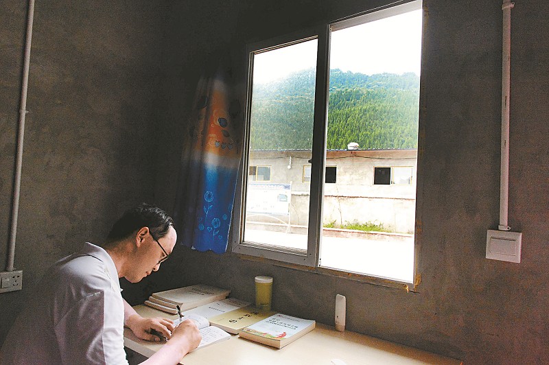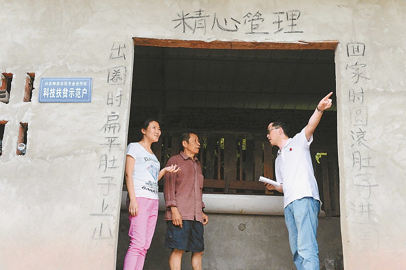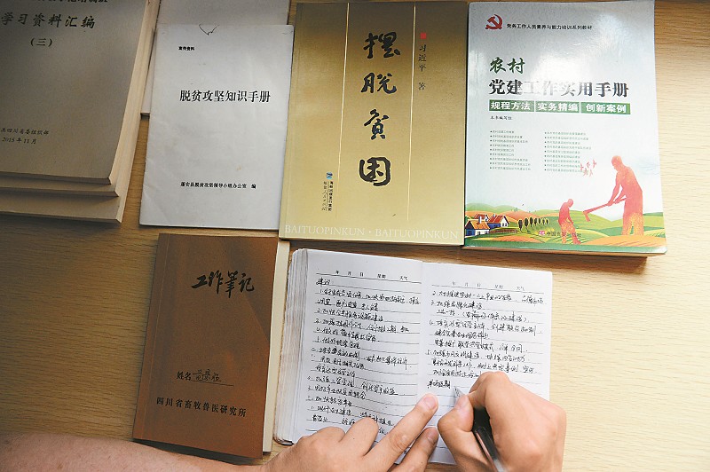 ①扶贫示范户唐道辉(中)把范景胜传授的养羊方法写到了羊圈大门上。 ②每天整理扶贫日记,已成为范景胜的习惯。 ③范景胜(中)来到村民家中了解房屋修建情况。 ④范景胜就住在离合作社羊圈不足10米的地方,为的是方便管理圈舍。 ⑤近一年的朝夕相处,村民们对范景胜这个扶贫的“羊硕士”十分满意。 8月18日,蓬安县杨家镇伏岭村,省农业厅下派农技员、驻村第一书记范景胜在村民的羊圈里忙得满头大汗。范景胜是西南大学动物遗传育种与繁殖专业的硕士研究生,到村里驻村扶贫已近一年。伏岭村是省农业厅定点帮扶的贫困村,属典型的偏远村、旱山村。全村有建档立卡贫困户53户183人,省农业厅来到该村开展帮扶时,全村人均纯收入不足1500元。