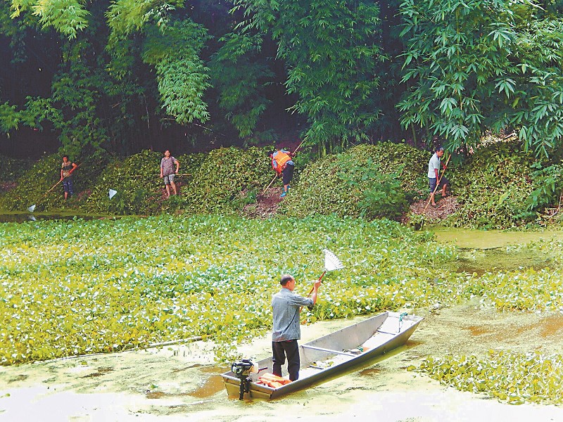 8月22日,岷江支流井研县茫溪河上,寻捞零星水葫芦的作业人员挥汗如雨。“这里水葫芦曾长成草坪,污染河流又无法撑船。”一名作业人员告诉记者,他们6月起下河打捞水葫芦,目前沿线打捞已较彻底,但为了防止零星水葫芦迅速蔓延,每天要巡查保洁。今年井研县启动茫溪河综合治理,计划投入20亿元实施“净水”“增水”“活水”三大工程,还茫溪河一湾清水。