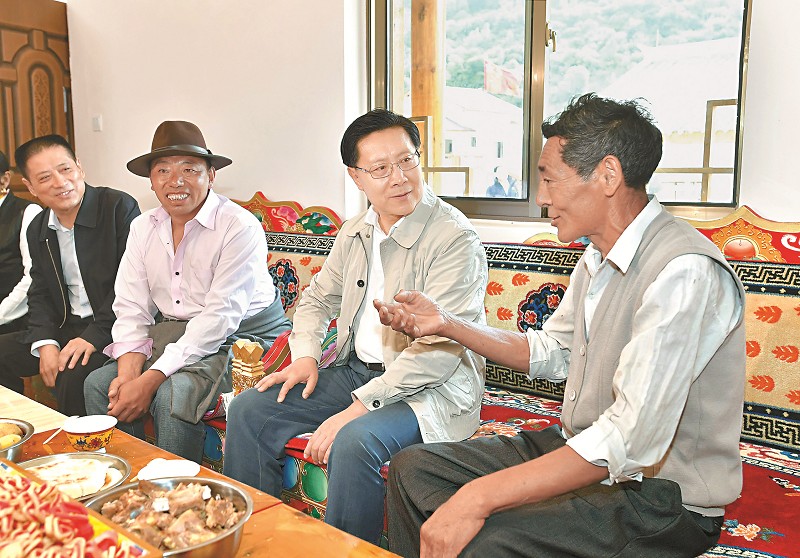 在贫困群众家中和藏区新居建设现场,王东明逐一核实联系领导、帮扶单位、驻村工作组、村党支部第一书记、驻村农技员信息,检查工作开展和作用发挥情况,并走进房间察看屋内设施,与基层干部和贫困群众深入交谈,详细了解致贫原因、脱贫计划、住房建设和就业增收、医疗教育等情况。王东明强调,打赢脱贫攻坚战,高标准实现“两不愁三保障”和“四个好”目标,必须一户一户分析致贫原因,一个问题一个问题研究对策措施。特别是要在用好用足已有帮扶政策的前提下,多措并举做好贫困群众兜底工作,通过整合资源力量、设立相关专项基金、引导社会救助等方式,有针对性地解决好贫困群众住房建设、产业发展、教育就业、治病就医等方面的具体困难。