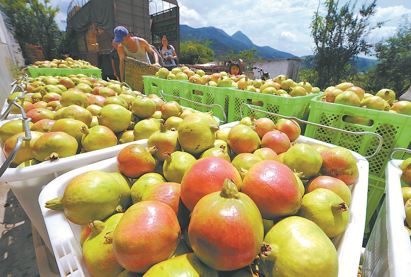 8月21日,攀枝花市仁和区大田镇,一辆载有3吨石榴的卡车正准备开往江西,这是今年当地石榴成熟后首次外销。近年来,仁和区大田镇发展优质石榴近700公顷,果农改变传统的销售模式,主要依托互联网接收订单外销到省外。