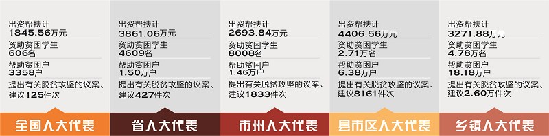 据不完全统计,截至今年8月底,国、省、市、县、乡五级人大代表出资帮扶就超过1.6亿元,其中,省人大代表出资帮扶3861.06万元,包括捐款2343.09万元、捐物1517.97万元。