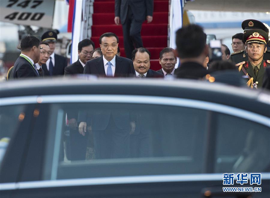 9月6日,应东盟轮值主席国老挝总理通伦邀请,国务院总理李克强乘专机抵达万象瓦岱机场,出席第十九次中国-东盟(10+1)领导人会议暨中国-东盟建立对话关系25周年纪念峰会、第十九次东盟与中日韩(10+3)领导人会议和第十一届东亚峰会,并对老挝进行正式访问。多位老挝政府高级官员到机场迎接。新华社记者饶爱民摄