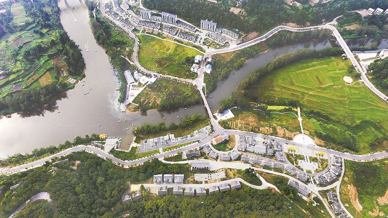 这是九月十七日在平昌县驷马镇当先村上空三百米处航拍的画面。当日是中秋节小长假最后一天,各地游客在驷马河中开游艇、坐游船,享受假日生活。 本报记者李向雨摄