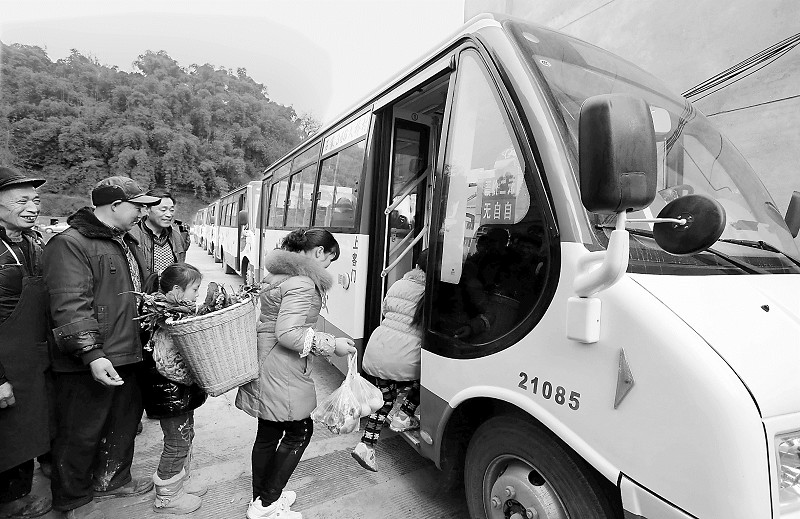 江阳区农民在家门口乘坐公交车出行。