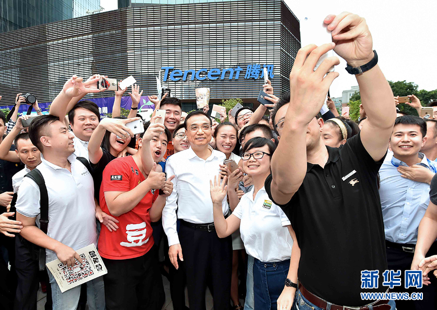 10月12日至13日,中共中央政治局常委、国务院总理李克强在广东深圳、东莞考察,并出席2016年全国大众创业万众创新活动周。这是10月12日,李克强在深圳全国“双创”周活动主会场深圳湾创业广场与创业团队成员合影留念。 新华社记者 李涛摄