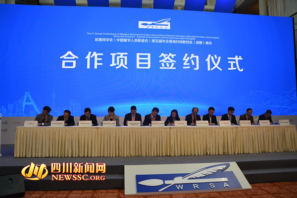 四川新闻网成都10月18日讯(记者 陈淋 摄影报道)10月18日上午,欧美同学会(中国留学人员联谊会)第五届年会暨海归创新创业(成都)峰会举行。会上,欧美同学会(中国留学人员联谊会)与四川省人民政府签署战略合作框架协议。四川新闻网记者从会议现场获悉,经过前期的深入对接和洽谈,与会各方代表还与四川省相关市(州)共签约合作项目53个,总投资额301.6亿元。其中,一产业项目3个,投资金额5.55亿元;二产业项目25个,投资金额114.05亿元;三产业项目25个,投资金额182亿元。