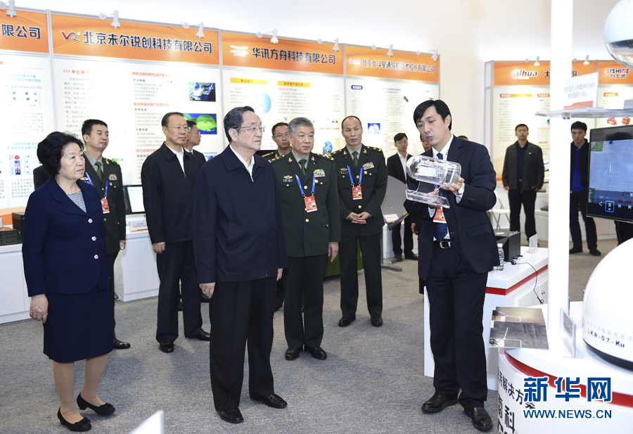 10月19日,中共中央政治局常委、全国政协主席俞正声在北京参观第二届军民融合发展高技术成果展。 新华社记者 张领 摄