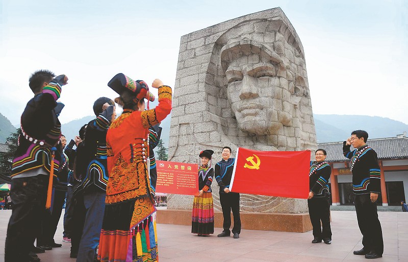 10月12日,石棉县安顺乡彝族党员在红军强渡大渡河纪念碑广场开展重温入党誓词活动。