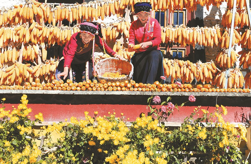 金秋时节,丹巴县中路乡基卡依村呈现出一派迷人的丰收景象。10月27日,阿初(左)和姐姐冲麦在藏家乐里忙着把晾晒好的玉米拿去磨粉。“去年我们村扩建了路面,游客越来越多,特别是最近几天的秋季风景吸引了全国各地的大批游客。”阿初说,她家去年国庆开办了藏家乐,有20多间客房,一年能接待客人2万余人次,年收入达15万元。