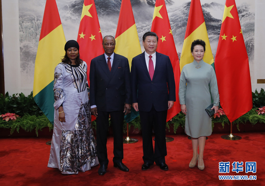11月2日,国家主席习近平在北京人民大会堂同几内亚总统孔戴举行会谈。会谈前,习近平在人民大会堂东门外广场为孔戴举行欢迎仪式。这是习近平和夫人彭丽媛同孔戴总统夫妇合影。新华社记者 鞠鹏 摄