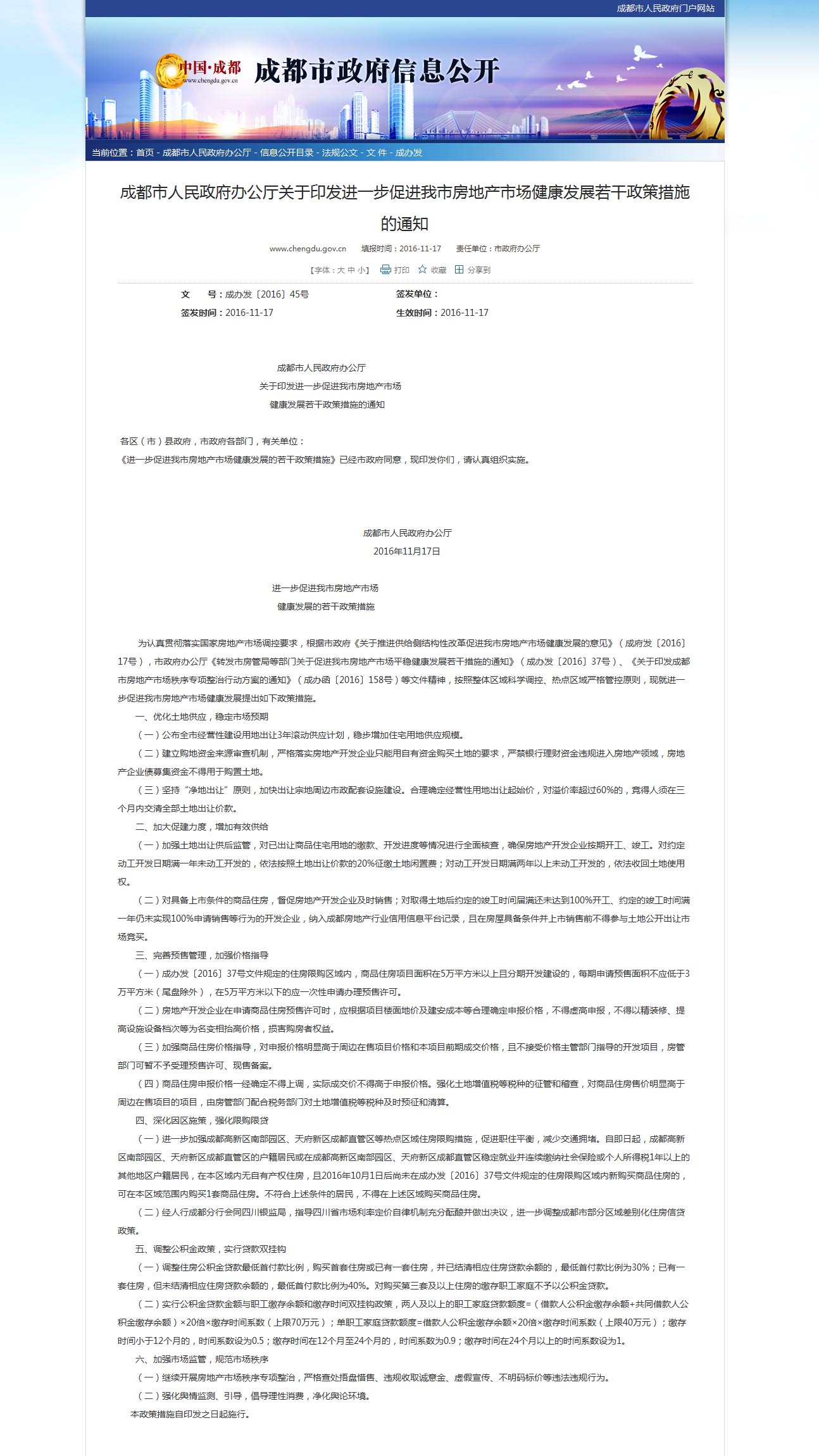 四川新闻网成都11月17日讯(记者李丹)今日,成都市人民政府办公厅发布《关于印发进一步促进我市房地产市场健康发展若干政策措施的通知》指出,将“深化因区施策,强化限购限贷”,并表示将“进一步加强成都高新区南部园区、天府新区成都直管区等热点区域住房限购措施,促进职住平衡,减少交通拥堵。”