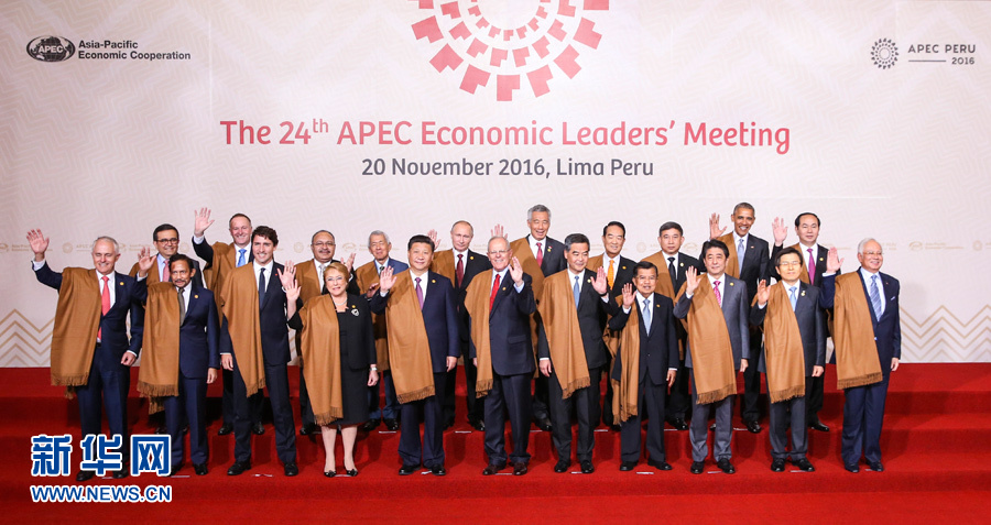 11月20日,亚太经合组织第二十四次领导人非正式会议在秘鲁利马举行。国家主席习近平出席并发表题为《面向未来开拓进取促进亚太发展繁荣》的重要讲话。这是会议期间,国家主席习近平同其他亚太经合组织成员经济体领导人、代表合影。新华社记者丁林摄