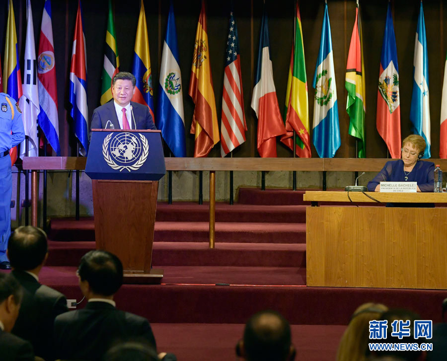 11月22日,国家主席习近平在圣地亚哥联合国拉丁美洲和加勒比经济委员会总部出席中拉媒体领袖峰会开幕式。智利总统巴切莱特陪同出席。在热烈的掌声中,习近平发表题为《开创中拉媒体合作新局面》的致辞。新华社记者鞠鹏摄