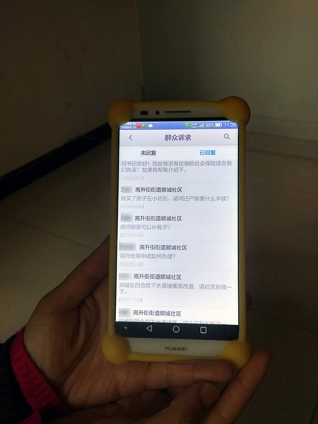 为了解社区内群众的需求,何小艳每天不停的刷新手机App。(社区供图)