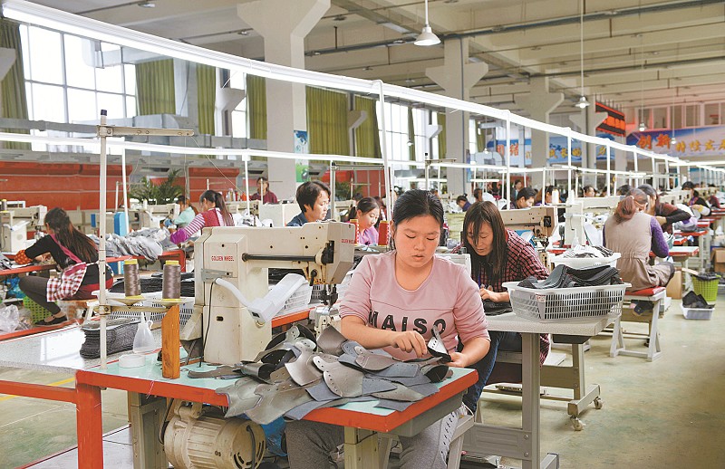 目前,大竹县1200余名农村贫困群众已实现家门口就业。图为11月30日上午,大竹工业园区内的某制鞋厂新进家在农村的员工正在加工生产皮鞋。 王晓林 摄