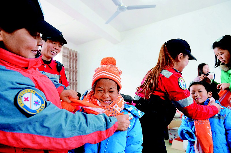12月9日,南充市红十字应急救援队来到蓬安县碧溪乡中心小学校,为该乡30户建档立卡贫困户子女送上“温暖包”。穿上“温暖包”里的衣服,戴上帽子、围巾,孩子们开心地笑了。
