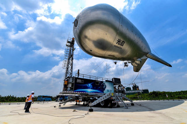 2016年7月7日,在光启东莞生态园研发基地,集广域互联网信息传输和光学监控于一体的“云端号”准备升空。新华社记者 毛思倩 摄