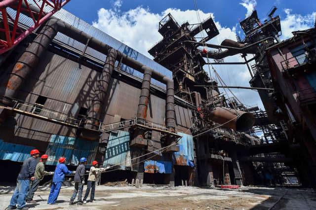 2016年8月31日,这是施工人员在地面牵引包头钢铁集团炼铁厂被拆除的2号高炉下降管。新华社记者 连振 摄