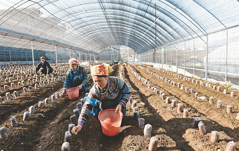 普格县五道箐乡洛果村积极调整产业结构,大力发展大棚蔬菜种植,增加贫困村民收入。图为12月8日,贫困村民在种植羊肚菌。宾文才 摄