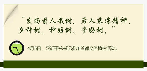 习近平总书记强调,发展林业是全面建成小康社会的重要内容,是生态文明建设的重要举措。各级领导干部要带头参加义务植树,身体力行在全社会宣传新发展理念,发扬前人栽树、后人乘凉精神,多种树、种好树、管好树,让大地山川绿起来,让人民群众生活环境美起来。
