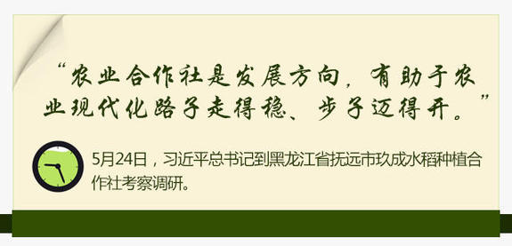 5月24日,习近平总书记来到黑龙江省抚远市玖成水稻种植合作社考察调研时,亲自登上插秧机,询问当地村民的收入、土地流转等情况。他指出,农民专业合作社是带动农户增加收入、发展现代农业的有效组织形式,要总结推广先进经验,把合作社进一步办好。
