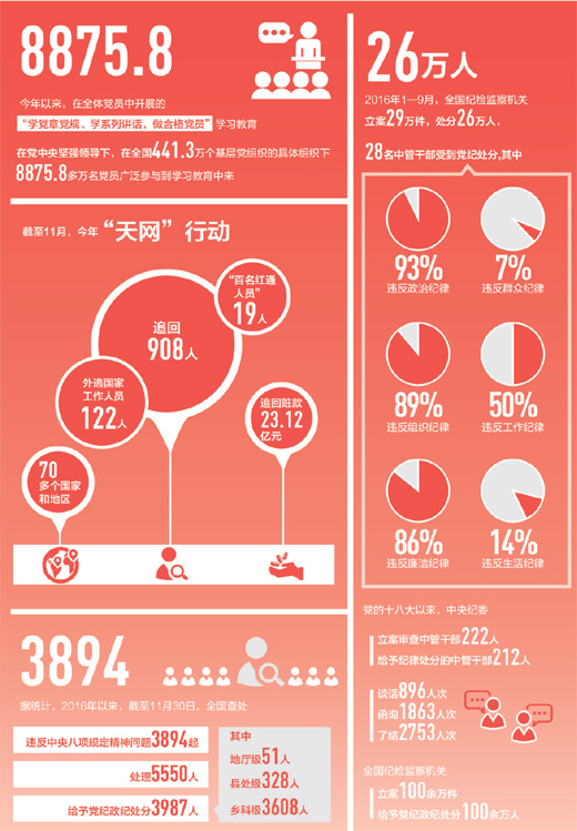 驰而不息、新招频出。据统计,2016年以来,截至11月30日,全国查处违反中央八项规定精神问题3894起,处理5550人,给予党纪政纪处分3987人,其中,地厅级51人,县处级328人,乡科级3608人。