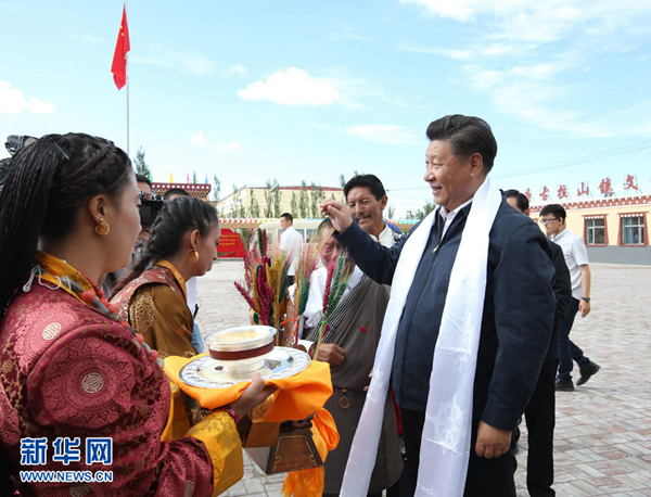 2016年8月22日至24日,中共中央总书记、国家主席、中央军委主席习近平在青海调研考察。这是8月22日下午,习近平在海西蒙古族藏族自治州格尔木市唐古拉山镇长江源村考察时接受村民献上的青稞酒。 新华社记者庞兴雷摄