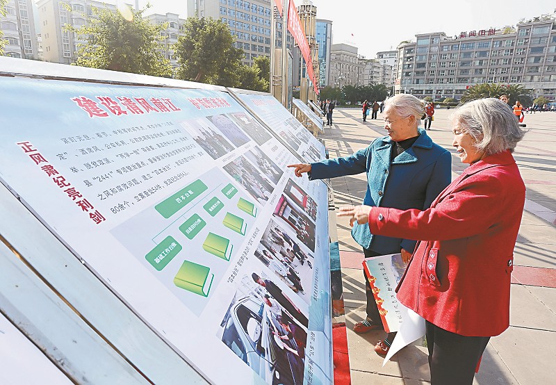 12月15日,天气晴好,南江县纪委反腐倡廉宣传展板前,两位老人在观看交流。 杨大琦 摄