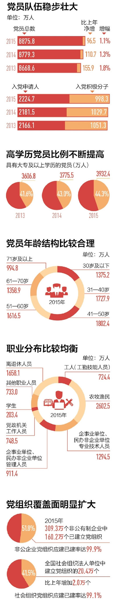 党员队伍稳步壮大。2013年,全国发展党员240.8万名,党员总数8668.6万名,比上年净增155.9万名,增幅为1.8%。2014年,党员总数为8779.3万名,比上年净增110.7万名,增幅为1.3%。2015年,党员总数为8875.8万名,比上年净增96.5万名,增幅为1.1%。新发展党员的增幅逐年缩小是我们党注重发展党员质量、严格把关的结果,实际上申请入党人数依然保持在很高的数量。2013年,入党申请人2166.1万名,其中入党积极分子1051.3万名。2014年,入党申请人2181.5万名,其中入党积极分子1029.7万名。2015年,入党申请人2224.7万名,其中入党积极分子998.3万名。这说明,中国共产党的党员队伍后继有人,充满生机活力。