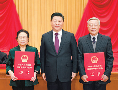 1月9日,2016年度国家科学技术奖励大会在北京人民大会堂隆重举行。中共中央总书记、国家主席、中央军委主席习近平向获得2016年度国家最高科学技术奖的中国科学院物理研究所赵忠贤院士(右)和中国中医科学院屠呦呦研究员(左)颁奖。新华社记者 李学仁摄