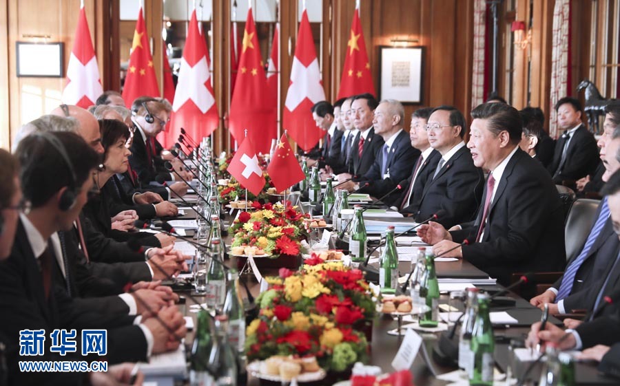 16日,国家主席习近平在伯尔尼同瑞士联邦主席洛伊特哈德举行会谈。两国元首积极评价中瑞关系,一致同意继续秉承开放包容理念,坚持走合作共赢道路,深化各领域务实合作,推动中瑞关系实现更好发展。瑞士联邦副主席贝尔塞,联邦委员兼财政部长毛雷尔,联邦委员兼外长伯克哈尔特,联邦委员兼经济、教研部长施奈德-阿曼共同参加会谈。