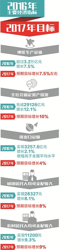 报告提出,2017年全省地区生产总值增长预期目标为7.5%左右,比2016年预期目标提高了0.5个百分点。省发展和改革委负责人表示,提出这一预期目标建议,充分考虑了与全国同步全面小康、稳定市场信心和增加就业的需要,也充分考虑了为结构调整留出空间和生态环境的承载能力。