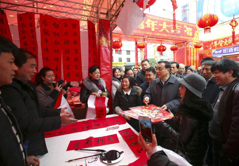 李克强23日来到云南昭通一条热闹的年货街。总理对摊主和来买年货的群众说,市场无信不立。只有诚信为本,大家才能买得安心、吃得放心,市场才能更加公平、更加红火。好日子要靠大家共同来创造,共同守护好。祝福大家过个舒心年,来年更红火!