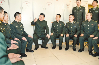 1月23日,中华民族传统节日——鸡年春节来临之际,中共中央总书记、国家主席、中央军委主席习近平专程来到陆军第65集团军,深入基层连队,看望慰问官兵,代表党中央和中央军委,向全军指战员、武警部队官兵、民兵预备役人员致以诚挚问候和新春祝福。这是习近平在该集团军“大功三连”同官兵在一起。