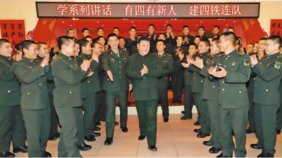春节将至,连队节日生活安排怎么样?习近平十分牵挂。他走进二排宿舍,摸摸被褥,看看衣物,关切地询问战士们能不能洗上热水澡、晚上宿舍冷不冷、过节准备得怎么样。排长赵斌报告说,连队设施很完备,过春节安排了包饺子、球类比赛、棋牌娱乐等活动,还有一台文艺晚会。听说节目都是战士们自编自演的,习近平很高兴。战士们情不自禁唱起《“四有”标准立起来》,表达矢志强军的坚定决心。习近平带头给战士们鼓掌,招呼大家围坐在一起,询问他们每一个人的学习、训练、思想情况,嘱咐他们要珍惜历史荣誉,当好“时代楷模”,自强不息,止于至善,在军队这个大学校中砥砺成长。离开宿舍时,习近平叮嘱部队领导安排好节日生活,让战士们过一个安全、欢乐、祥和的春节。