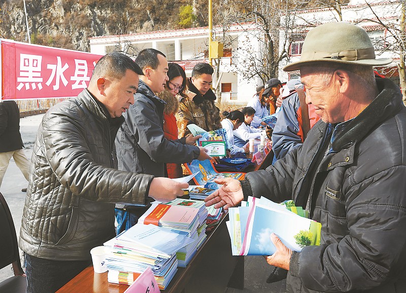 黑水县工作人员为村民发放种养类科技读物。
