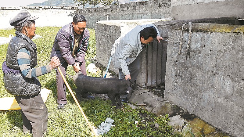 省人社厅驻凉山州布拖县特木里镇先锋村第一书记叶向东(右一),给特困户采购能繁母猪带动脱贫。