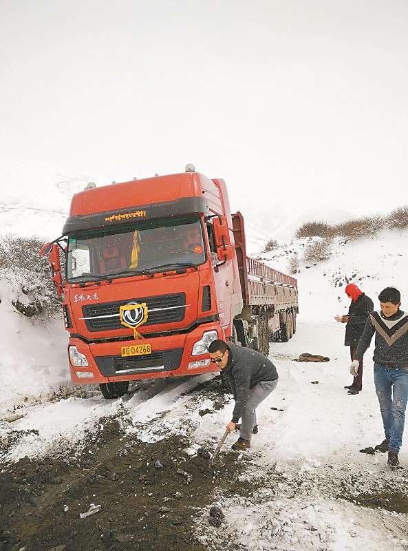 省新闻出版广电局驻石渠县哈伟村第一书记黄欣帮助清除路面积雪,以保障牲畜越冬草料安全运送。 受访者供图