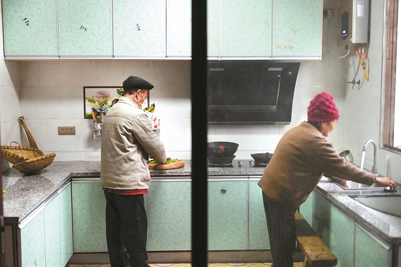 村民杨胜友(左)和老伴在家里准备晚饭。杨胜友在新村有两套房子,全家田地都流转给业主,老两口还在园区打工赚钱。