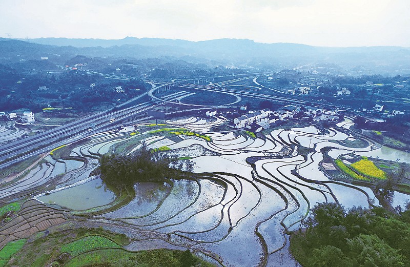 2月27日,俯瞰泸州市纳溪区白鹤林高速立交桥,与乡村田园错落有致,形成春天的别样画卷。近年来,泸州市依托“两纵两横两联”高速公路网,加快建设全国重要区域性综合交通枢纽(节点城市)。 杨涛 摄