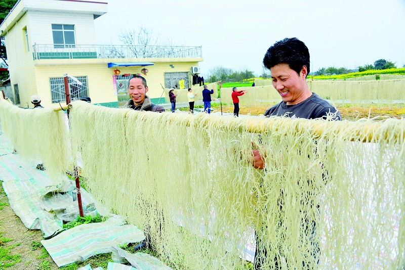 3月3日,记者到绵竹市富新镇清狮村1组采访,正遇上村民魏友林与家人在翻晒红苕粉条。