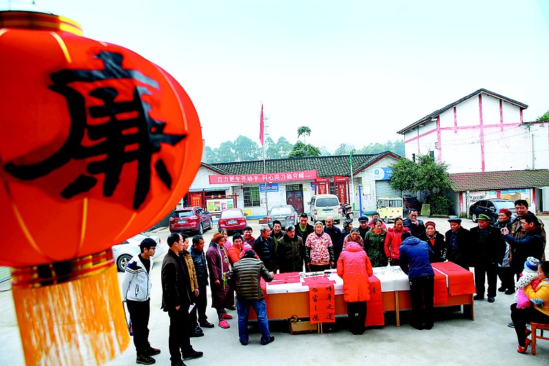 2017年1月14日,广安市广安区纪委监察局、总工会邀请书法家为方坪乡棋盘村村民、干部书写“廉洁春联”。 廖小兵 摄(视觉四川)
