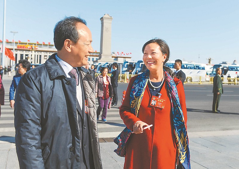 谢商华委员(右)在天安门广场和其他委员交流参会心得。
