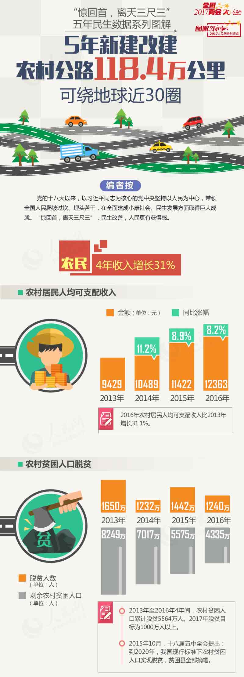 这是一组对农村发展非常关键的数据。2013年年底,交通运输部部长杨传堂表示,当年我国新建改建农村公路21万公里。政府工作报告则表明,2014年新建改建农村公路23万公里;2015年,达25.1万公里。2016年,达29.3万公里。2017年,还将新建改建农村公路20万公里。如果2017年目标顺利实现,5年间,我国新建改建农村公路总里程数将达到118.4万公里,相当于绕地球近30圈!