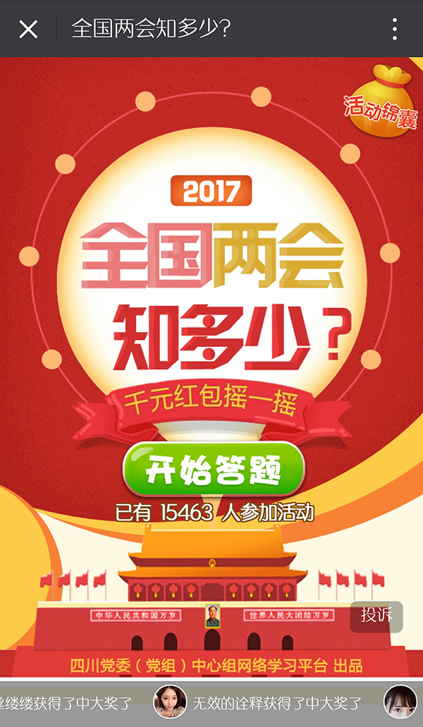 在2017年全国两会胜利闭幕之际,四川省党委(党组)中心组网络学习平台于昨日下午16:00特别推出“全国两会知多少”有奖竞答活动,截至今日13:00已有15463名网友参与,其中有上千名网友领取了答题奖励红包,这次轻松学习两会知识的小活动,获得了很多网友的高度好评。