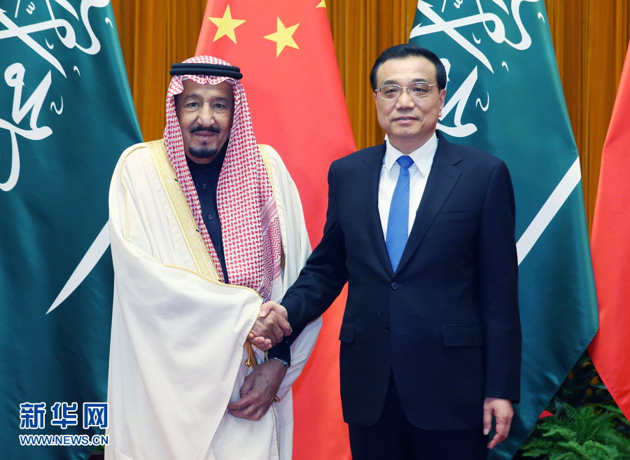 3月17日,国务院总理李克强在北京人民大会堂会见来华进行国事访问的沙特国王萨勒曼。 新华社记者姚大伟摄